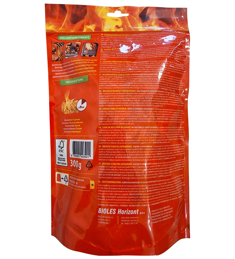 Večnamenska, za prižiganje ognja v vseh pečeh na trdo gorivo, kaminih, roštiljih in ognja na prostem. Narejena je iz naravnih snovi: lesenih trakov in voska, ne vsebujejo kemikalij in je okolju prijazna.